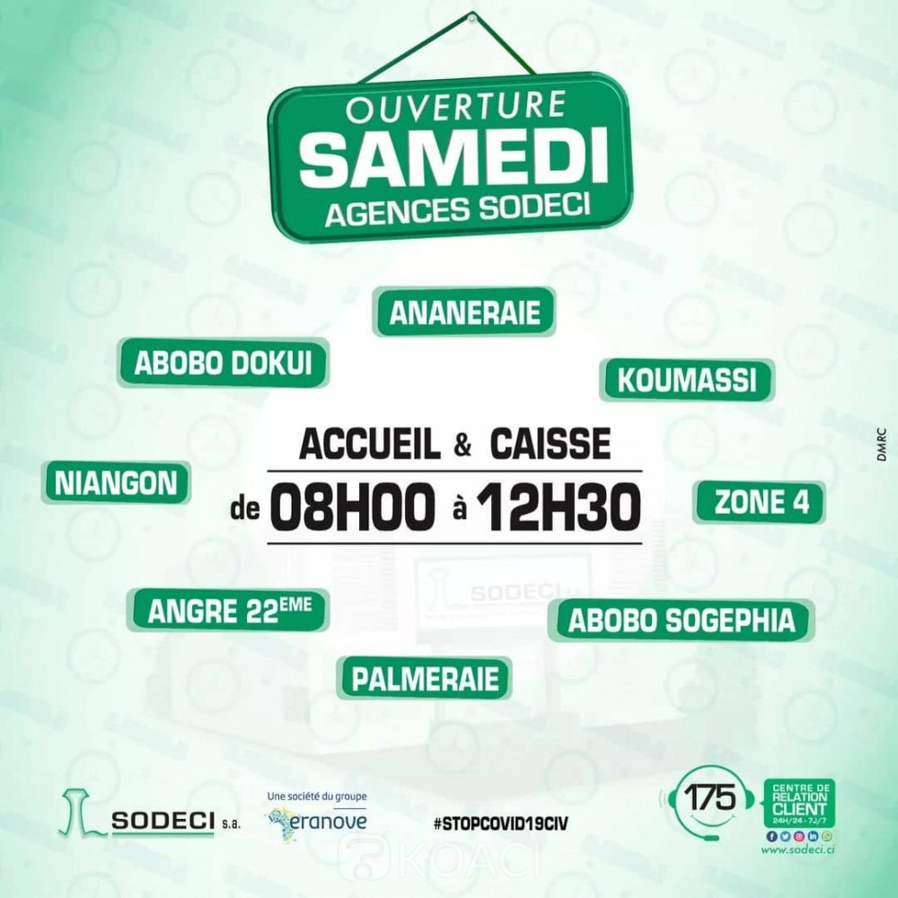 À partir du 10 avril 2021, les Agences SODECI mentionnées ci-dessous vous accueillent désormais tous les samedis de 8H à 12H30 pour toutes vos opérations.