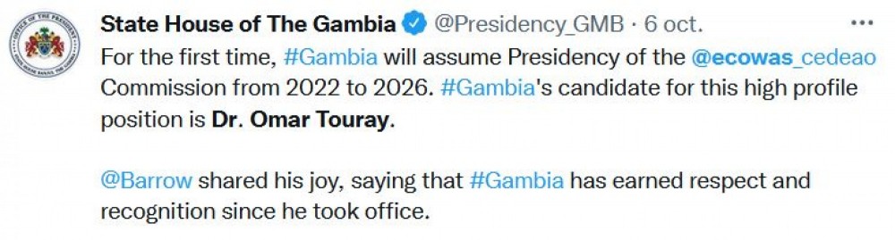 En réaction à la désignation du Dr Touray comme le prochain président de la Commission de la CEDEAO, le Président Adama Barrow a accueilli la nouvelle aujourd'hui avec joie et a affirmé qu'il s'agit d'un signe de reconnaissance du pays dans la sous-région. Il a noté que la Gambie a gagné plus de respect parmi ses pairs de la sous-région depuis son accession au pouvoir en 2017.