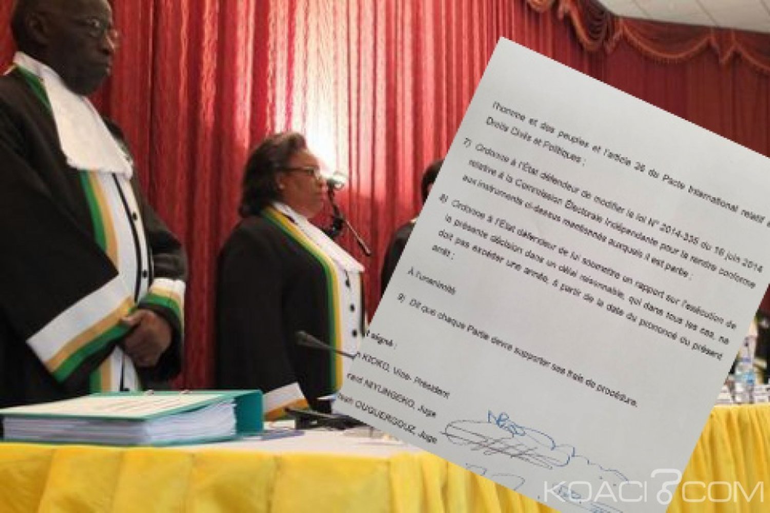 Article 7 : "Ordonne à l'Etat défendeur de modifier la loi N°2014-335 du 18 juin 2014 relative à la commission électorale indépendante pour la rendre conforme aux instruments ci-dessus mentionnés auxquels il est partie."
