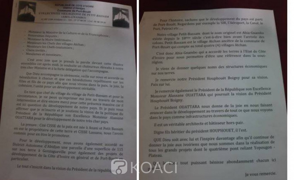 « Aujourd’hui, il est question du départ des Dougbô et l’arrivée des Tchagba au pouvoir. Il est vrai que nous avons fini notre mandat et sommes entrain de partir. Mais il ne faudrait pas que nous partons dans des conditions calamiteuses. Nous constatons que les Tchagba s’entredéchirent et nous ne pouvons pas l’accepter. Il y a des dissensions en leur sein. Nous assistons à une bagarre entre deux camps Tchagba. Chez nous, pour arriver au pouvoir, il faut respecter les us et coutumes. Après concertation vous faites un bloc et vous désignez un chef que vous présentez à l’équipe sortante. C’est à elle d’accepter ou pas. Mais ce n’est pas le cas ici à Petit Bassam. Un noyau veut imposer un chef à toute une communauté et cela nous disons non ! Si vous marchez sur les us et coutumes, nous ne pouvons pas être d’accord. Il y a des critères qui n’ont pas été respectés par ce groupe. Par contre l’autre camp a respecté les us et coutumes des Atchans. Ils nous ont présenté un chef qui est Gouedji Yesso Ebenezer-André. Le chef qu’on veut nous « imposer » ne remplit pas les conditions. Il ne peut pas gouverner et gérer ce village. Je vous en cite quelques conditions : Il faut avoir une épouse au village ; Être responsable ; Avoir des enfants ; Il faut travailler... Ce n’est pas le cas avec celui qu’on veut nous imposer. Je voudrais relever que, c’est à deux jours que le chef a été informé de la tenue d’une consultation populaire. Il a alors demandé un report, mais les autorités ont refusé d’où le désordre survenu à Petit Bassam. Nous lançons un appel au président de la République, Alassane Ouattara. Il veut un pays de paix et nous sommes en période de réconciliation nationale. On ne peut pas donner un arrêté à quelqu’un qui ne fait pas l’unanimité. On ne peut pas accepter qu’on installe la pagaille dans notre village. Nous voulons la paix dans ce village qui a beaucoup souffert. Nous sommes en parfaite harmonie avec la vision du chef de l’Etat. Nous lui disons merci parce qu’il est entrain de tout mettre en œuvre pour qu’il ait la paix dans ce pays. La preuve, il a mis en place un Ministère de la Réconciliation nationale. Je voudrais aussi rebondir sur certaines informations distillées afin de nous dénigrer auprès des autorités du pays. Elles font cas du fait que nous sommes des opposants au président de la République, ce qui est archi-faux ! En 2010, c’est ici à Petit Bassam que le président de la République a commencé sa campagne électorale. C’est les Dougbô qui étaient au pouvoir. Il avait confié que Port Bouët est la porte d’entrée d’Abidjan, de ce fait, Petit Bassam est le village ancêtre de la commune tant bien qu’il y a quatre villages Ebrié. Il s’est rendu chez le chef de Village Gnagne Nimba Richard de la génération Dougbô. Nous sommes avec le Président de la République qui est un fils du village comme il l’avait dit lors de sa visite. J’étais dans l’équipe municipale du Ministre Siandou Fofana en 2018 en tant que son conseiller, alors comment on peut-on nous taxer d’opposants ? Lors d’une Visite du Ministre Bandaman Maurice, le discours du chef prononcé que j’ai rédigé, nous avions dit, que nous suivons la vision du président de la République qui est un homme de paix et qu’il est le digne fils héritier de feu Félix Houphouët Boigny. Nous nous inscrivons dans son projet de développement de la Côte d’Ivoire qu’il a engagé. Et c’est cette chefferie Dougbô qui est encore là. Alors pourquoi un tel dénigrement de la part de nos frères juste dans le but d’avoir un arrêté préfectoral ? Quand on veut être chef, on n’utilise pas les voies détournées en allant calomnier les autres auprès des autorités. Ce qui s’est passé à Petit Bassam, nous dénonçons cela. Nous pensons que c’est un coup qui a été savamment préparé contre notre village et nous ne pouvons l’accepter. Nous voulons la paix dans notre village, rien que la paix. »
