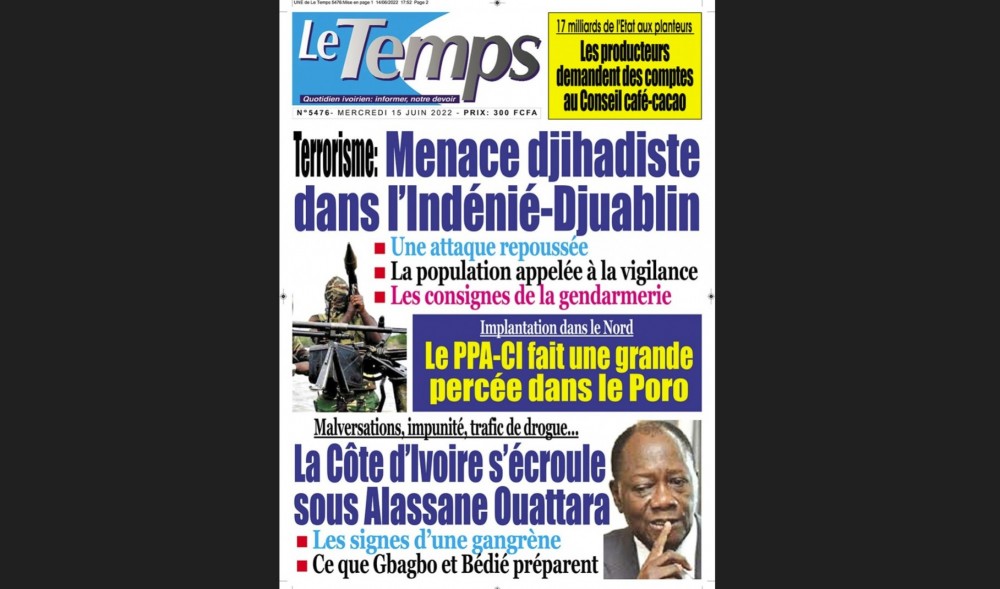 Ce mercredi 15 juin 2022, un média pro-Gbagbo (Le Temps, appartenant à Nady Bamba, ndlr) a publié à sa une qu’une attaque Djihadiste a été repoussée dans la région de l’Indénié-Djuablin (Est).