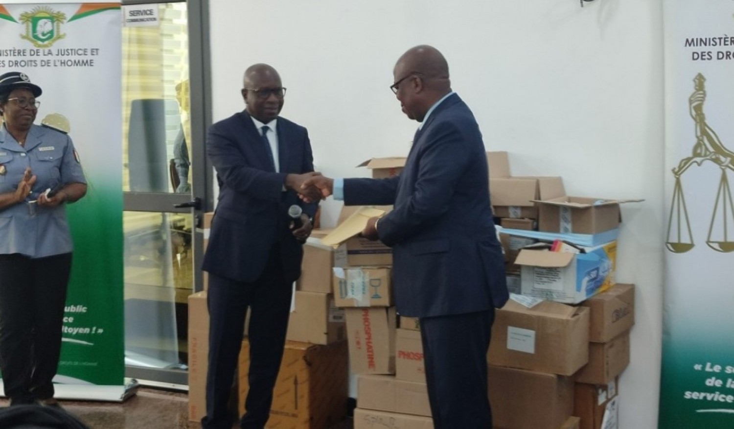 Kouassi Bernard, Directeur de cabinet, représentant le Garde des Sceaux, ministre de la Justice et des Droits de l’Homme, Jean Sansan Kambilé a remis, jeudi 25 juillet 2024, cet important lot de matériel au Directeur de l’Administration Pénitentiaire, Célestin Doheuly Kamin au cours d'une cérémonie qui s'est déroulée à l’Intendance de l’administration pénitentiaire, sise à la Riviéra-Attoban.
