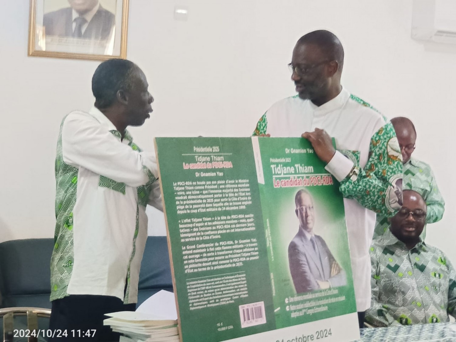 Tout d'abord, Gnamien Yao a offert un présent symbolique à Tidjane Thiam. Ensuite, il a officiellement présenté un ouvrage intitulé "Présidentielle 2025 : Tidjane Thiam, le candidat du PDCI-RDA", publié par l'Institut africain de développement et de stratégies (IADS).