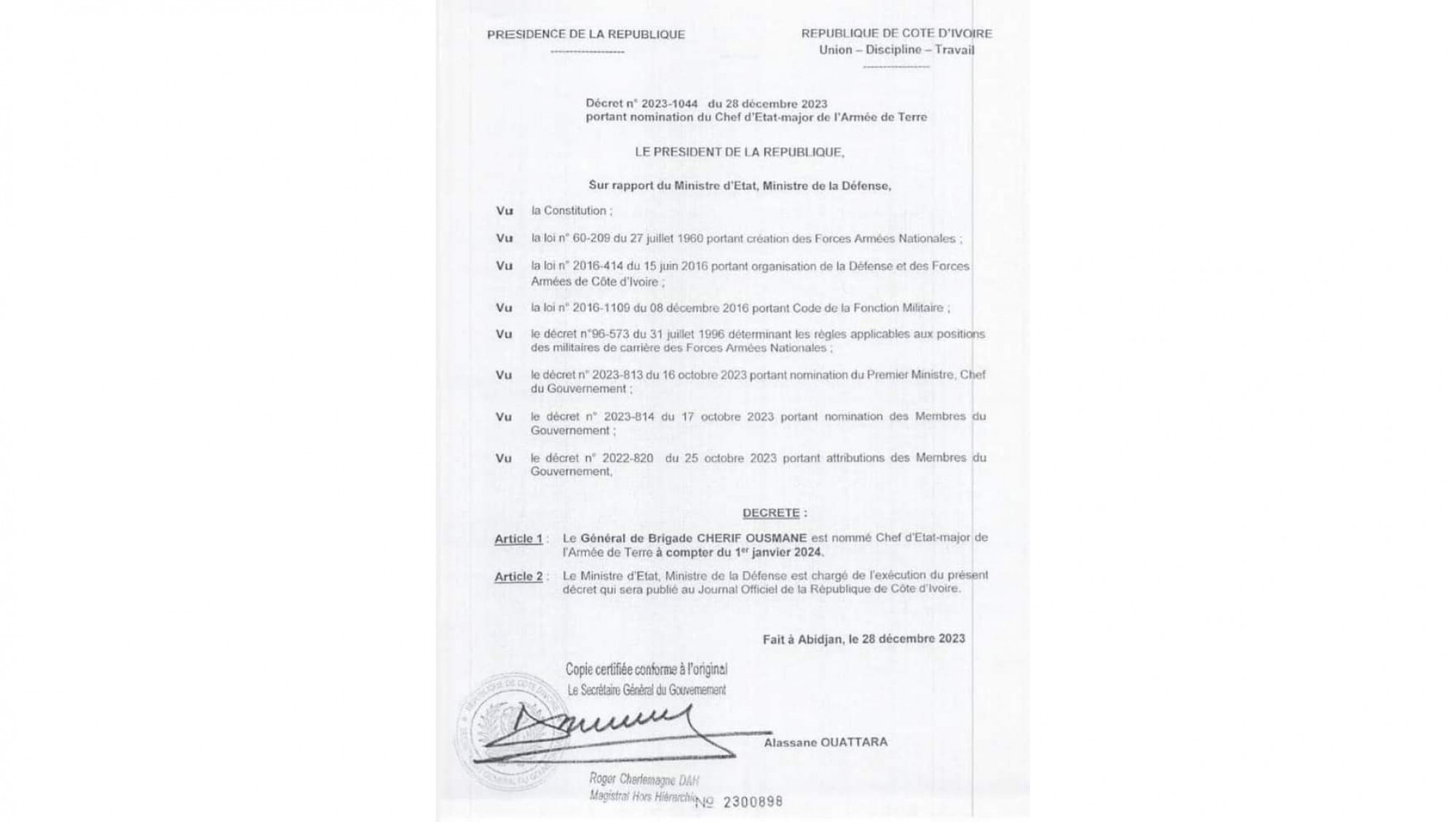 Côte d'Ivoire : Face aux menaces régionales, Ouattara nomme le Général Cherif Ousmane à la tête de l'armée de terre