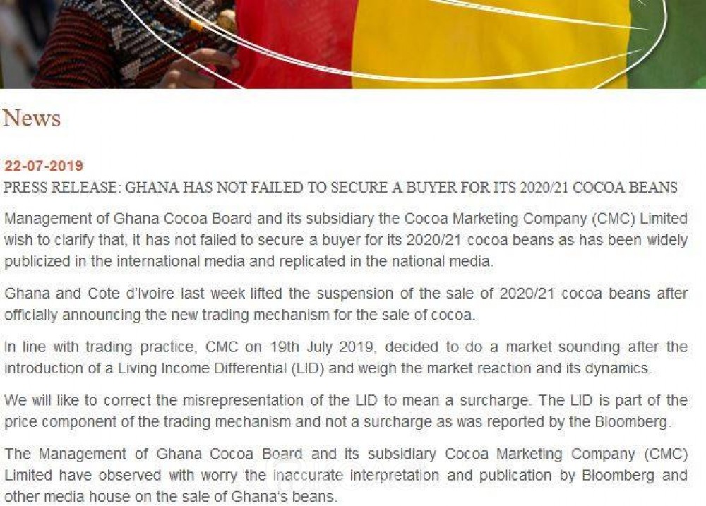 D’après un communiqué publié hier lundi par Joseph Boahen Aidoo, le directeur général de COCOBOD, il est expliqué que la société Cocoa Marketing Company (CMC) a décidé la semaine dernière de lancer un sondage sur le marché après l'introduction du différentiel de revenu vital (LID) afin d’évaluer la réaction du marché et sa dynamique.