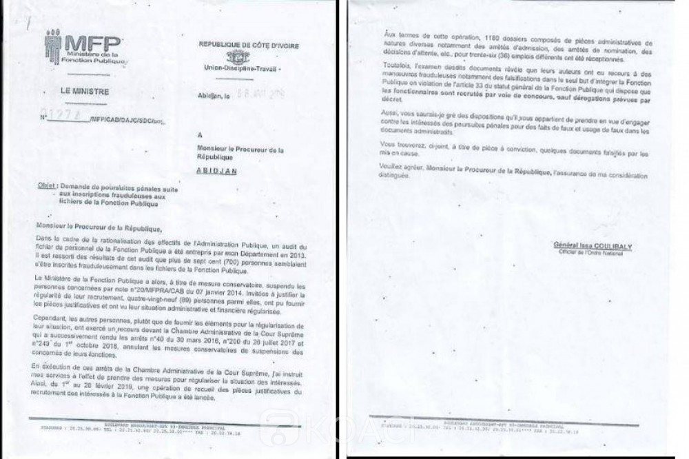 En effet, le ministre de la Fonction Publique, le General Issa Coulibaly, a officiellement saisi le procureur de la République, Richard Adou, en aout 2019, pour une « demande de poursuites pénales suite aux inscriptions frauduleuses aux fichiers de la Fonction Publique ».