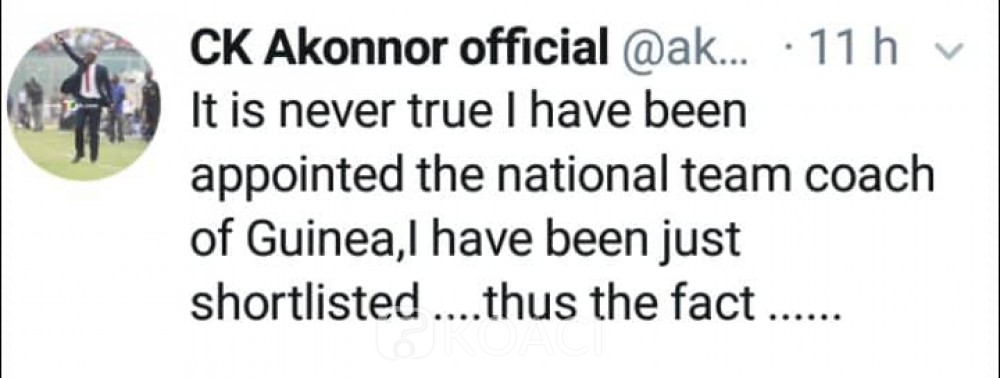 Dans un tweet publié ce mercredi, Akonnor a écrit que « Ce n’est jamais vrai que j’ai été nommé entraîneur de l’équipe nationale de la Guinée, j’ai juste été présélectionné ... ».