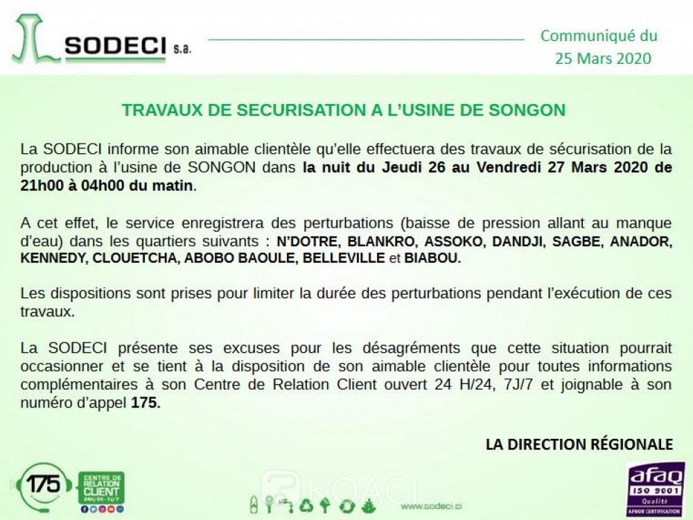 5 Côte d'Ivoire : Communiqué de la SODECI relatif à la coupure d'eau du mercredi 6 nov...