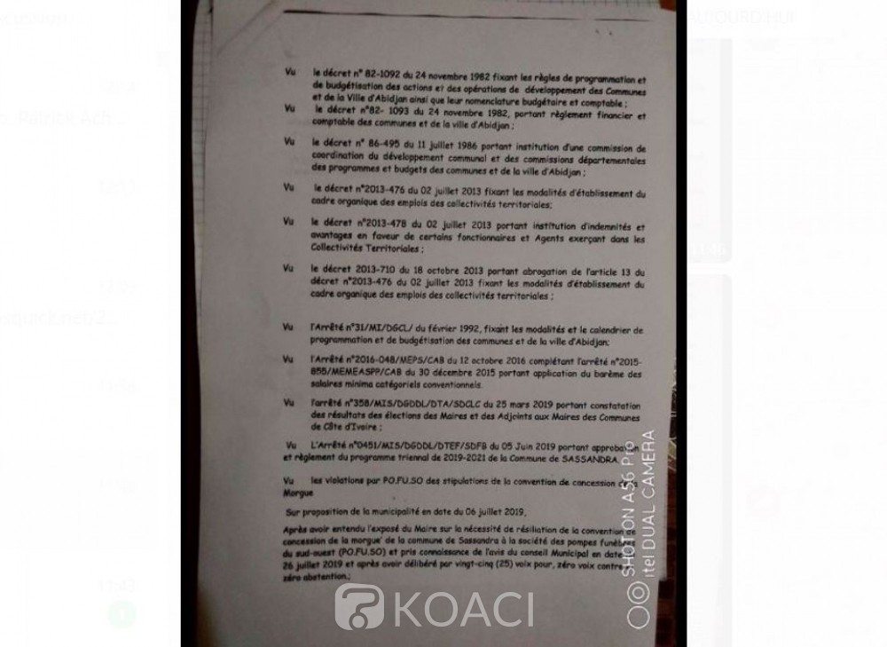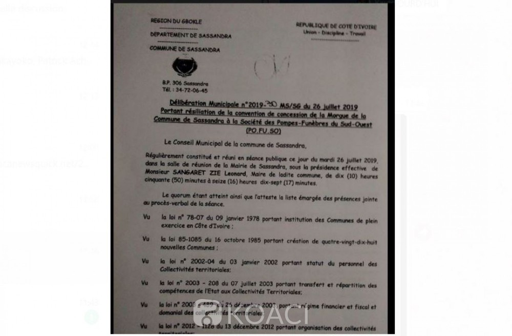 Au regard donc de tout cela et soucieux de l'amélioration de la qualité des services de la morgue, le conseil municipal à sa grande majorité (25) a décidé en juillet 2019 donc de la résiliation pure et simple de la convention liant la commune de Sassandra à la Société PO.FU.SO.