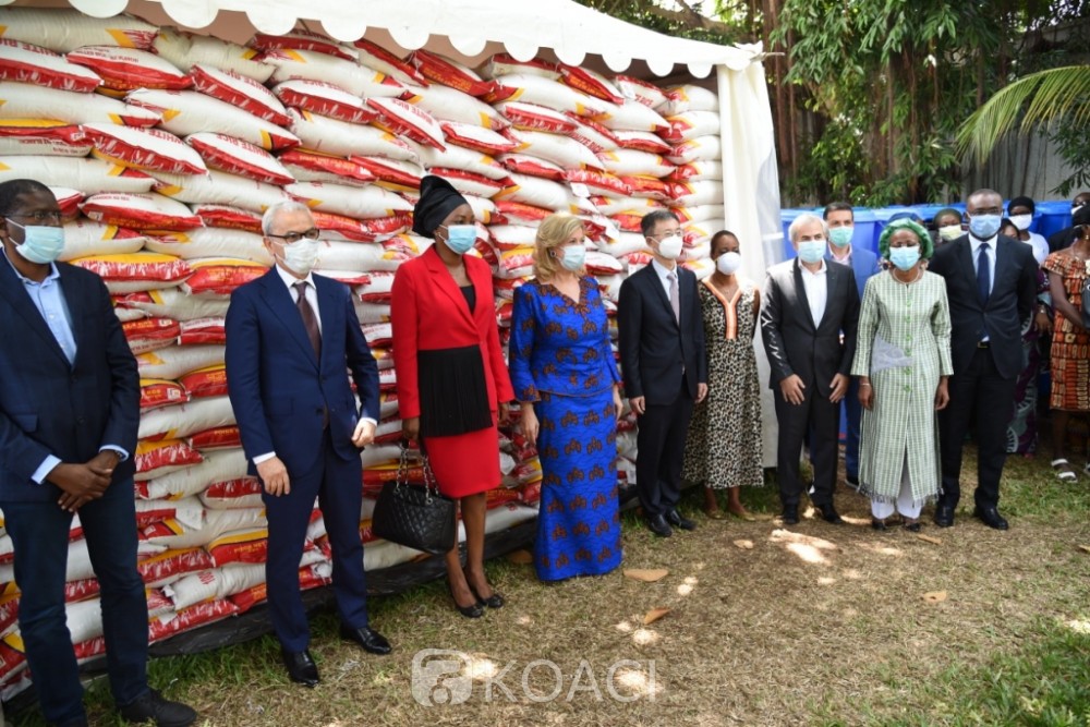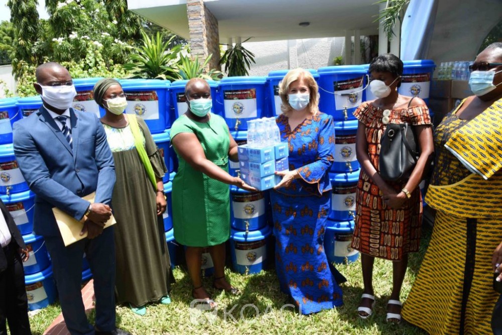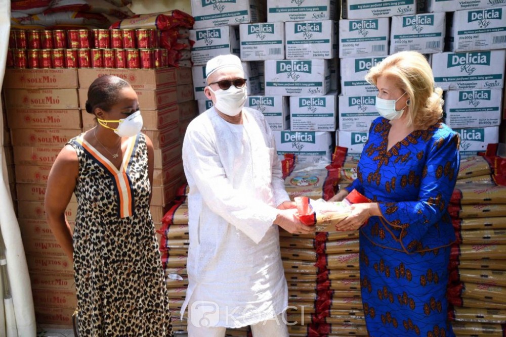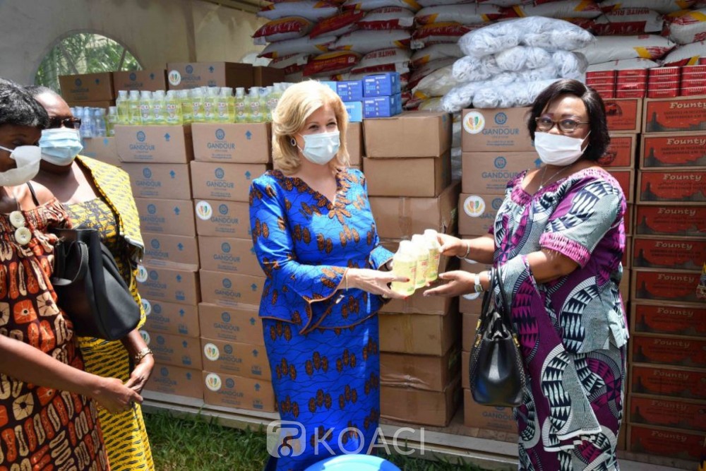 Madame Dominique Ouattara, Présidente de la Fondation Children Of Africa a offert des dons d’une valeur de 130 millions F CFA en produits alimentaires et sanitaires à une centaine d’ONG engagées dans la protection des femmes et des enfants, le mardi 28 avril 2020.