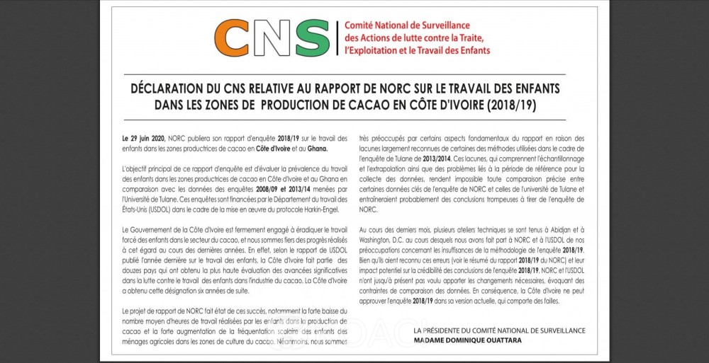 La Première Dame de Côte d’Ivoire, Présidente du Comité National de Surveillance des Actions de lutte contre la Traite, l’Exploitation et le Travail des Enfants (CNS), SEMme Dominique OUATTARA a toujours été engagée, dans la lutte contre la traite et les pires formes de travail des enfants. C’est d’ailleurs la raison pour laquelle a été nommée, à la tête du CNS. Depuis, bien d’actions ont été constamment menées dans le but d’éradiquer ce phénomène. En 2012 et même l’an dernier par exemple, le rapport du Département d'Etat américain sur la problématique a reclassé, la Côte d'ivoire à un rang satisfaisant. Dans le processus d’actions particulièrement dynamique, la loi relative à l’école obligatoire a été adoptée, marquée dans le même temps par la construction de bien de salles de classe, notamment dans les zones rurales, le recrutement d’enseignants, la distribution gratuite de kits et de tenues scolaires… Peut-on même noter, la condamnation de nombreux trafiquants d’enfants, chose qui n’existait avant. Une démarche qui démontre une fois de plus que, cette question lancinante est, à la tête des priorités des autorités ivoiriennes qui ne ménagent aucun effort. Cela dit, ce rapport ne peut pas être crédible en toute objectivité.