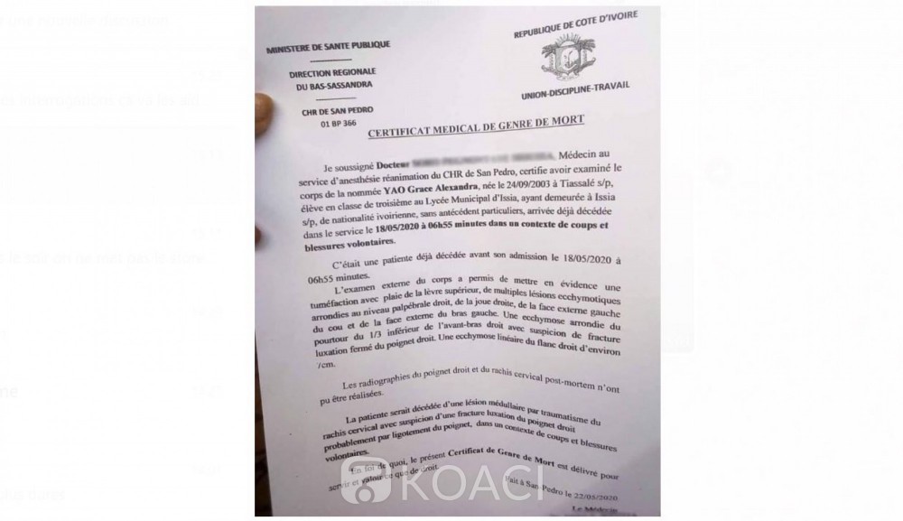 Selon la famille, ce sont les faits réels et n’ont pas ce que l’église tente de faire croire à l’opinion. La preuve, selon le certificat médical transmis à KOACI, le document révèle que, la patiente est décédée d’une lésion médullaire, par traumatisme du rachis cervical, avec suspicion d’une fracture luxation du poignet droit probablement par ligament du poignet, dans un contexte de coups et de blessures volontaires.