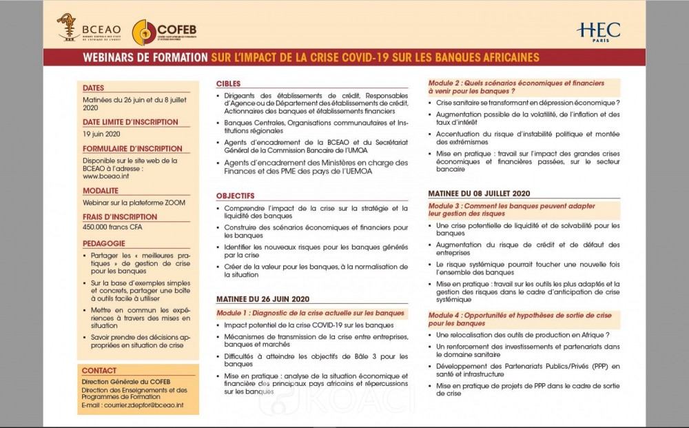 Avec le concours de HEC-Paris et du Centre Ouest Africain de Formation et d'Etudes Bancaires (COFEB), la Banque Centrale des États de l'Afrique de l'Ouest (BCEAO) organise une série de séminaires en ligne (webinars) à caractère international sur le thème « Impact de la crise Covid-19 sur les banques africaines. », apprend KOACI de l'institution sous-régionale basée à Dakar.