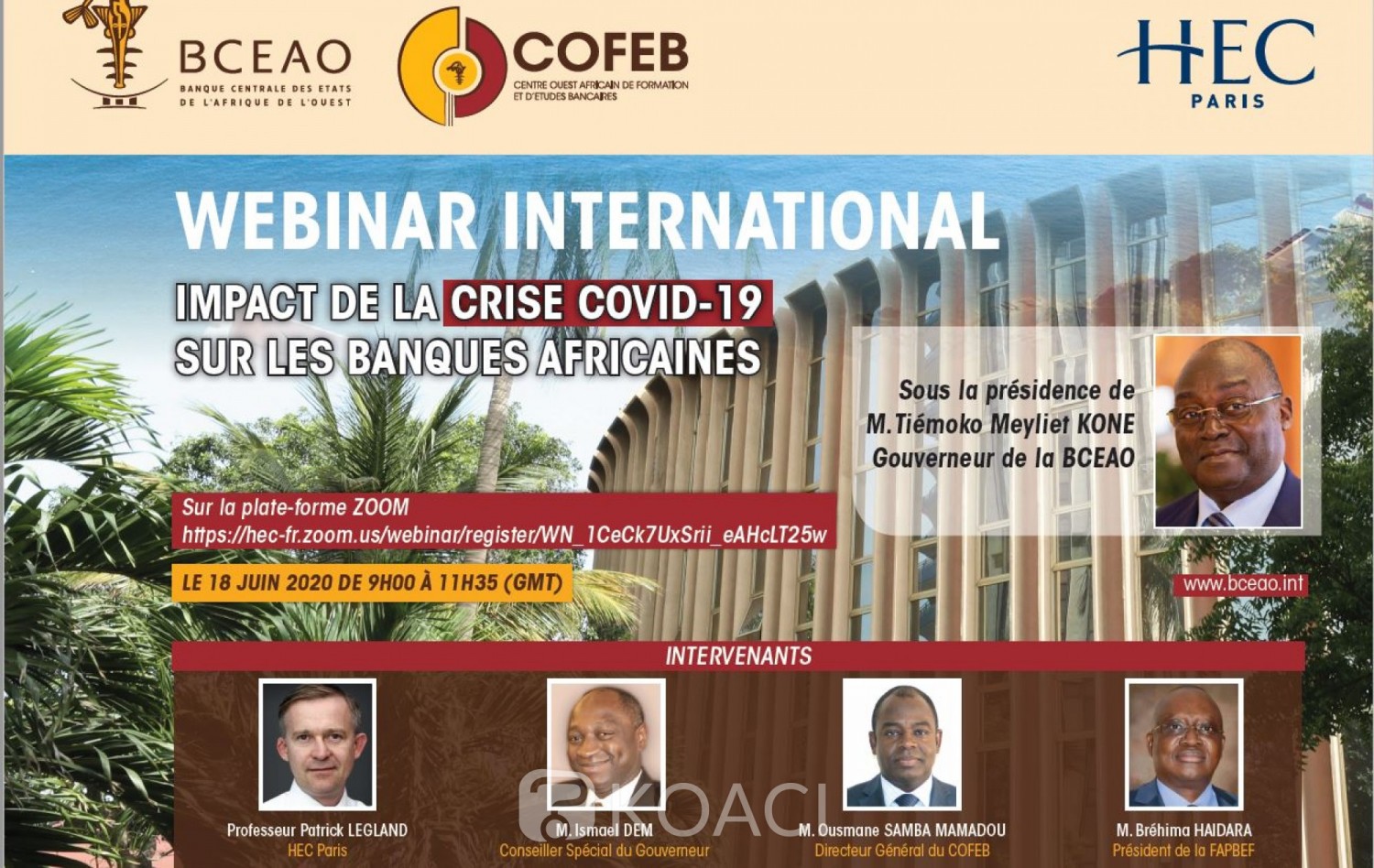 Ce programme de formation aux dates du 26 juin 2020 et du 8 Juillet 2020, sera précédé, le 18 juin 2020 de 9h à 11h 35, par un webinar de lancement international, une visio-conférence de haut niveau, présidée par Tiémoko Meyliet Koné, Gouverneur de la BCEAO.