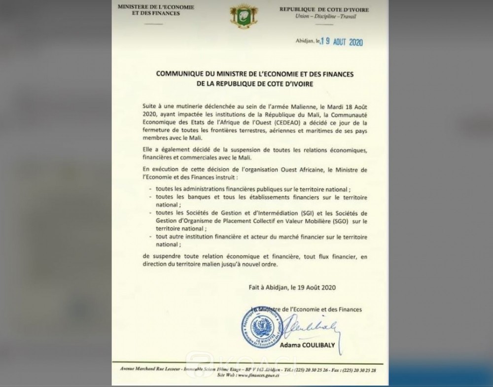 Cette décision d'Abidjan est en application de celles-ci prises par la communauté des états de l'Afrique de l'ouest (CEDEAO), suite au coup d'état militaire qui a renversé le président démocratiquement élu en 2018, Ibrahim Boubakar Keita dit IBK.