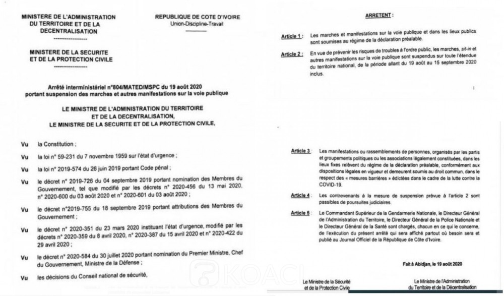 Le Ministre de l’Administration du Territoire et de la Décentralisation Sidiki Diakité et son collègue de la sécurité, le Général Vagondo Diomandé, ont pris un arrêté interministériel no 804 du 19 août 2020 portant suspension des marches et autres manifestations sur la voie publique.