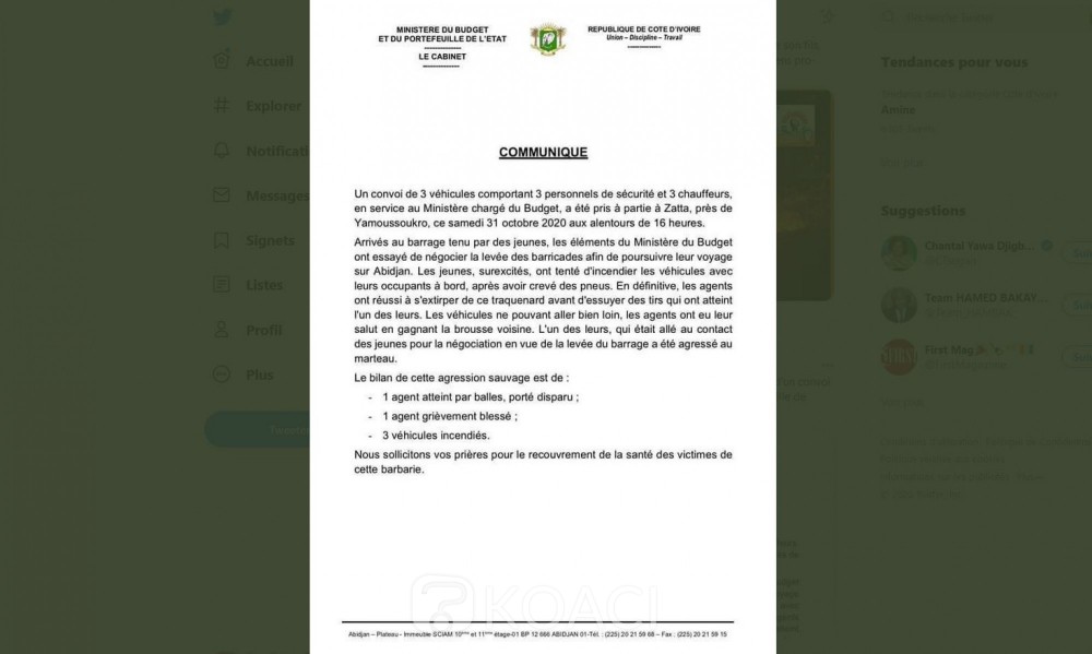 Le Ministre du Budget a annoncé à travers un communiqué la mort d'un agent de sa sécurité, un gendarme selon nos informations, après une attaque d'un cortège de son ministère à Zatta, dans les alentours de Yamoussoukro, samedi après midi.