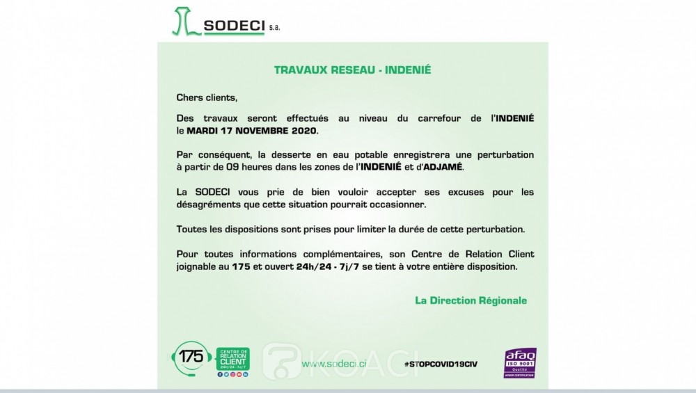 5 Côte d'Ivoire : Communiqué de la SODECI relatif à la coupure d'eau du mercredi 6 nov...