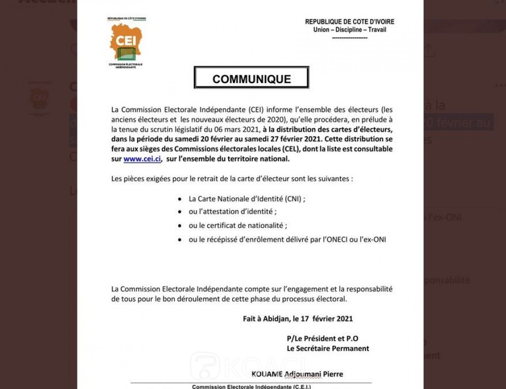 Côte d'Ivoire : Législatives 2021, distribution des cartes d'électeurs dans la période du 20 février au 27 février 2021