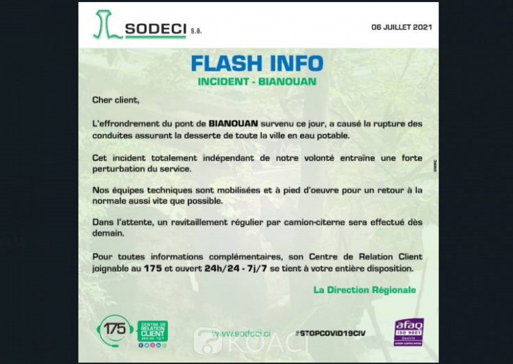 Côte d'Ivoire : Incident - Bianouan, communiqué de la Sodeci