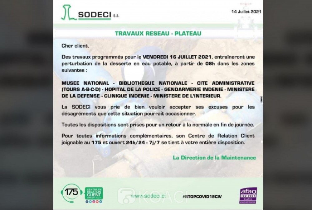 5 Côte d'Ivoire : Communiqué de la SODECI relatif à la coupure d'eau du mercredi 6 nov...