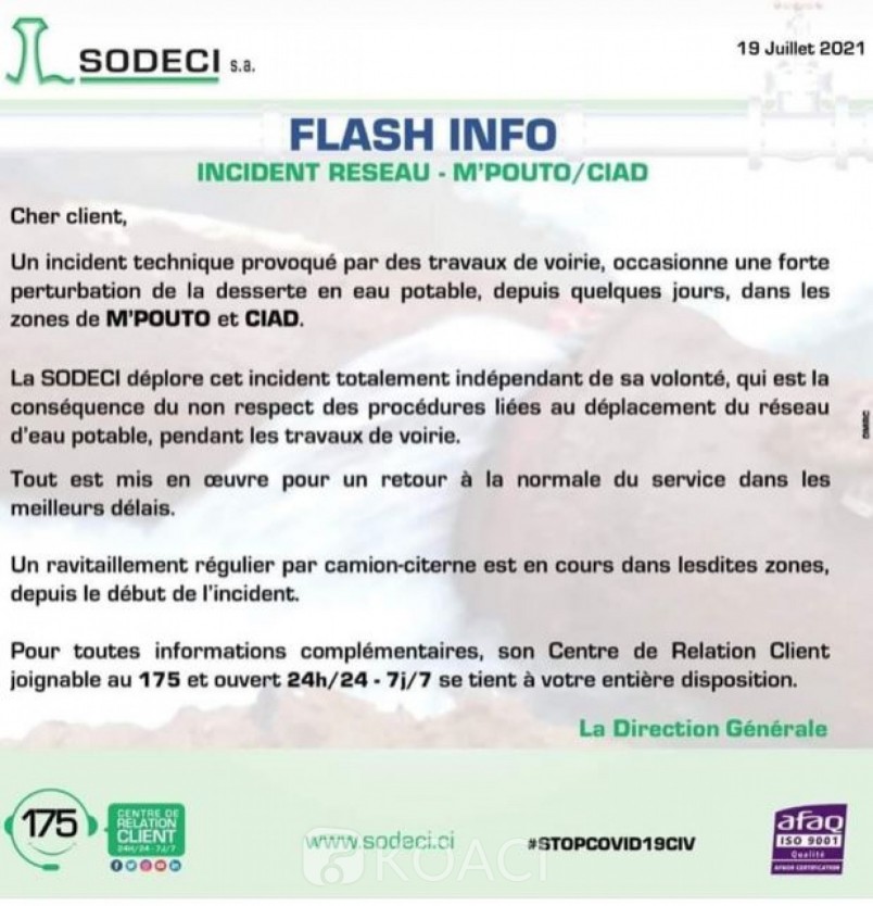 5 Côte d'Ivoire : Communiqué de la SODECI relatif à la coupure d'eau du mercredi 6 nov...