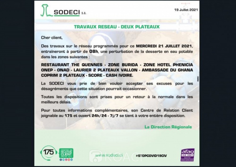5 Côte d'Ivoire : Communiqué de la SODECI relatif à la coupure d'eau du mercredi 6 nov...