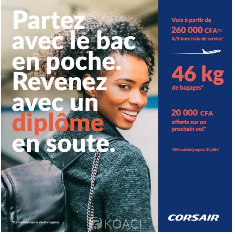 Corsair aime les étudiants ivoiriens et le prouve de nouveau avec des prix et des conditions très attractifs proposés du 6 juillet au 15 août 2021, pour les étudiants ivoiriens voyageant vers la France. Avec Corsair, les Ivoiriens décollent vers la France avec le bac en poche et reviennent avec un diplôme en soute.