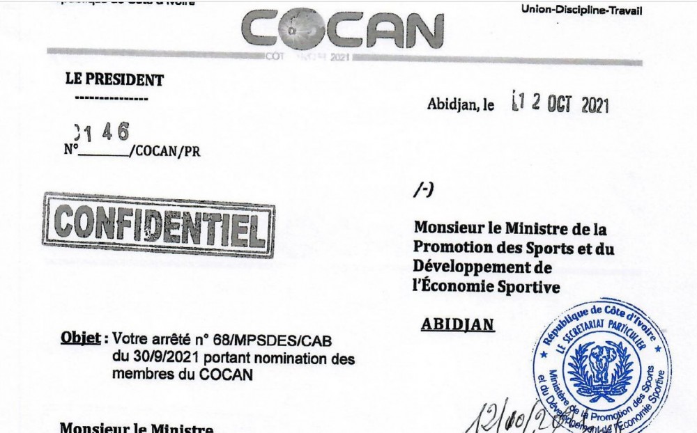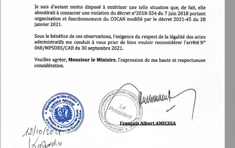 Et comme il fallait s’y attendre, le président du COCAN, Albert Amichia François, a adressé un courrier ce mardi 12 octobre 2021 au Ministre des Sports.