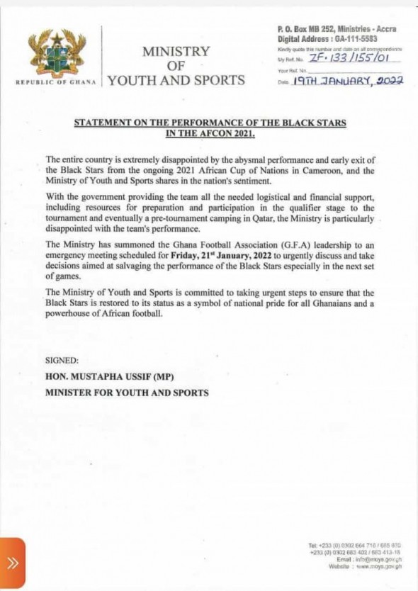 Le ministère ghanéen de la Jeunesse et des Sports a convoqué les responsables de a Fédération Ghanéenne de Football (GFA) pour une réunion d'urgence le vendredi 21 janvier 2022 au sujet de la honteuse sortie des Black Stars à la Coupe d'Afrique des Nations (CAN 2021) en cours au Cameroun.