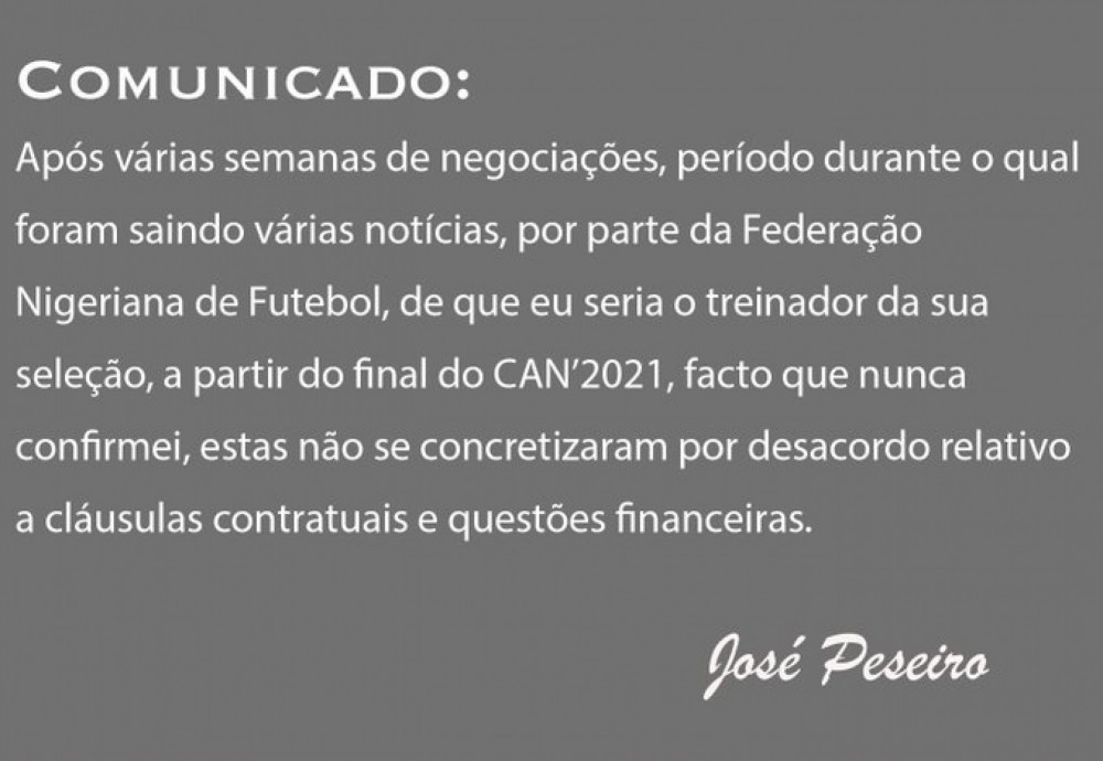 En revenant sur principale raison de l’échec de la signature de son contrat, Peseiro a publié sur Twitter qu’ « Après plusieurs semaines de négociations, au cours desquelles plusieurs annonces ont été faites par de la Fédération nigériane de football que je serai l'entraîneur de leur équipe nationale, à partir de la fin de la CAN 2021, ce que je n'ai jamais confirmé, celles-ci ne se sont pas concrétisées en raison d'un désaccord sur les clauses contractuelles et les questions financières ».
