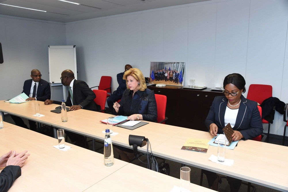 « Nous avons souhaité vous rencontrer pour vous exprimer nos préoccupations et échanger avec vous relativement à la nouvelle législation envisagée par l’Union Européenne concernant l’importation de certains produits, notamment le cacao qui est notre matière première de base et le pilier de notre économie », a indiqué Madame Dominique Ouattara, Présidente du CNS, accompagnée entre autres de M. Adama Kamara, Ministre de l’Emploi et de la Protection Sociale et de M. Alain-Richard Donwahi, Ministre des Eaux et Forêts.