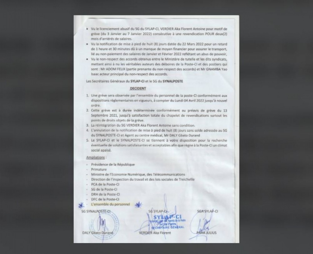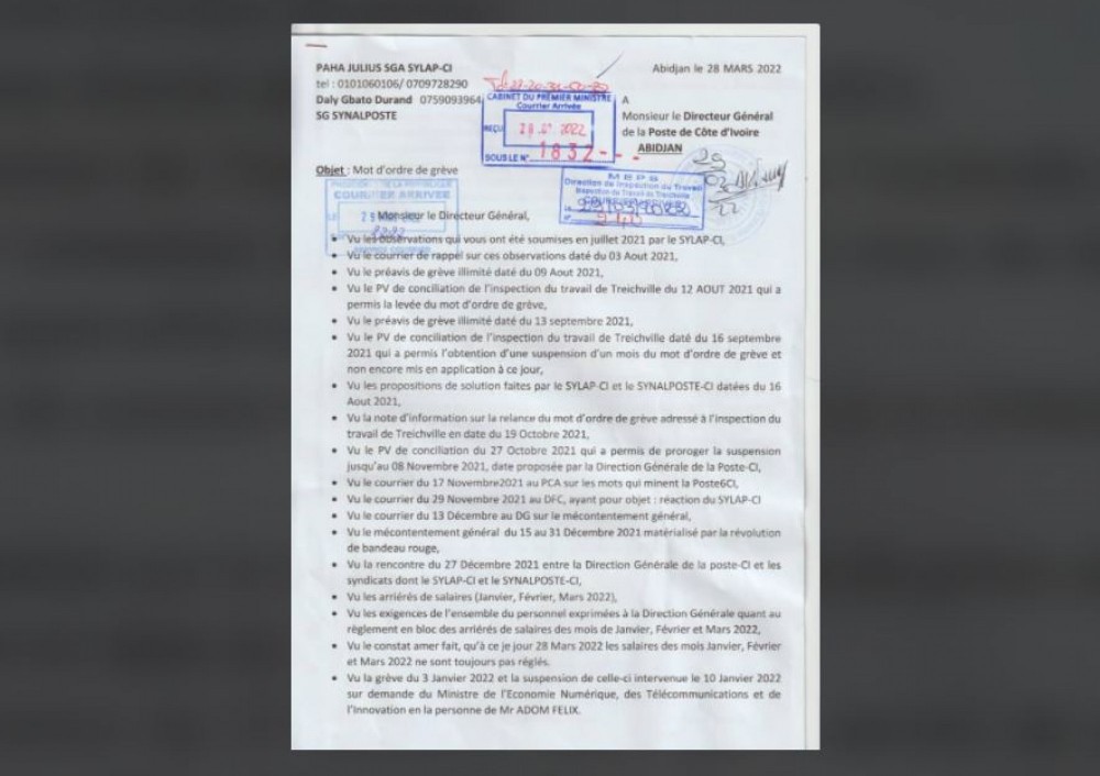 Dans un document transmis ce mercredi 30 mars 2022 à KOACI, le SYLAP-CI et le SYNALPOSTE, annoncent une grève illimitée à compter du lundi 04 avril 2022.