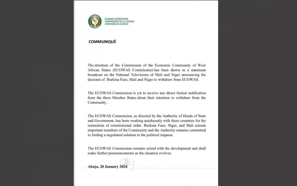 "La Commission de la CEDEAO n'a pas encore reçu de notification formelle directe des trois États membres concernant leur intention de se retirer de la Communauté.", relève-t-on.