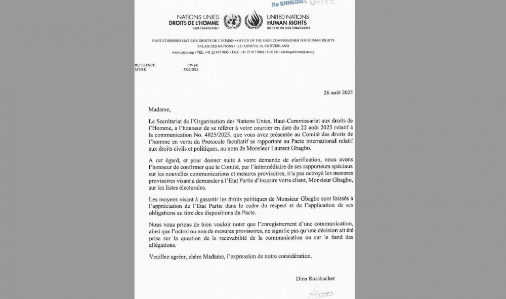 Dans une lettre adressée à l’avocat de Laurent Gbagbo et consultée par la rédaction de KOACI.COM, le Haut-Commissariat confirme que le Comité, par l’intermédiaire de ses rapporteurs spéciaux sur les nouvelles communications et les mesures provisoires, n’a pas accordé la demande visant à contraindre l’État ivoirien à réintégrer M. Gbagbo sur les listes électorales.
