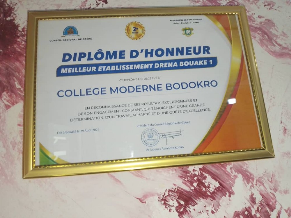 En effet, le Lycée Moderne de Bodokro a récemment reçu le Diplôme d’Honneur du Meilleur Établissement de la DRENA Bouaké 1, décerné par le Conseil Régional de Gbêkê, en reconnaissance de ses résultats scolaires remarquables et de la discipline instaurée au sein de l’établissement.