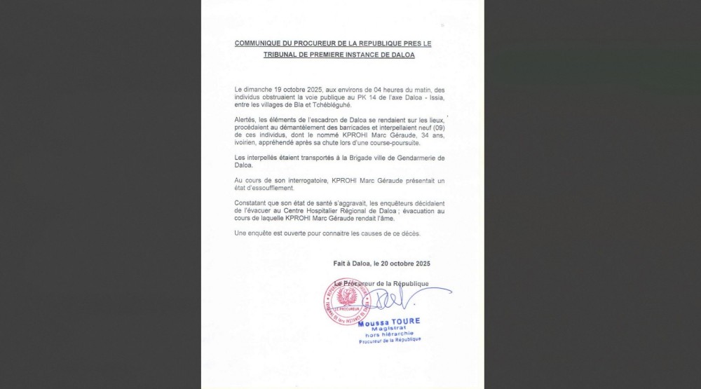 Selon un communiqué du Procureur de la République signé du Magistrat hors hiérarchie, Moussa Touré, le dimanche 19 octobre 2025, aux envirions de 4 heures du matin, des individus obstruaient la voie publique au PK 14 de l’axe Daloa-Issia entre les villages de Bla et Tchébléguhé.