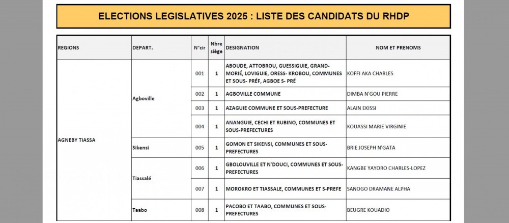 Le Rassemblement des Houphouëtistes pour la Démocratie et la Paix (RHDP) a officiellement rendu publique la liste de ses candidats pour les élections législatives à venir. Sur les 255 sièges que compte l’Assemblée nationale, le parti au pouvoir a désigné 205 candidats, laissant 50 circonscriptions sans représentation directe.