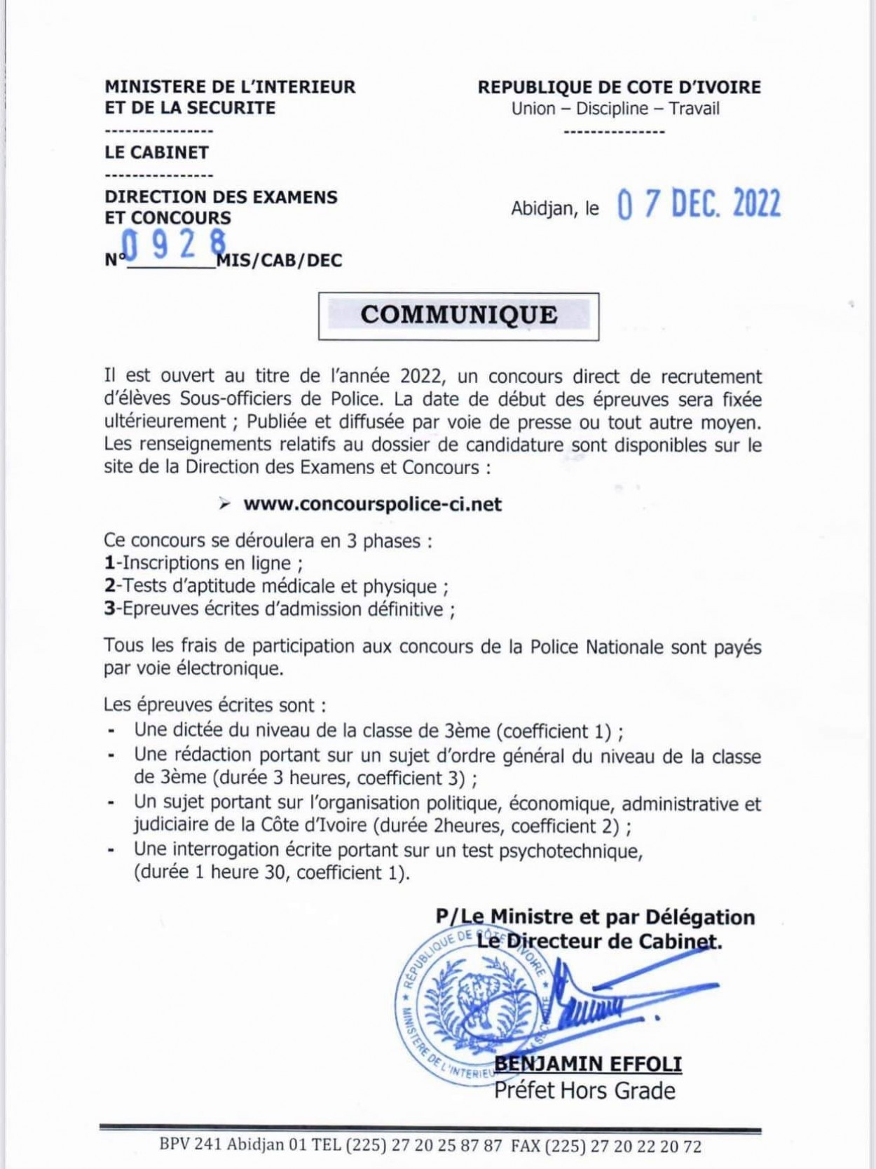 Côte d'Ivoire : Un concours direct de recrutement d'élèves sous-officiers au titre de l'année 2022 de police lancé