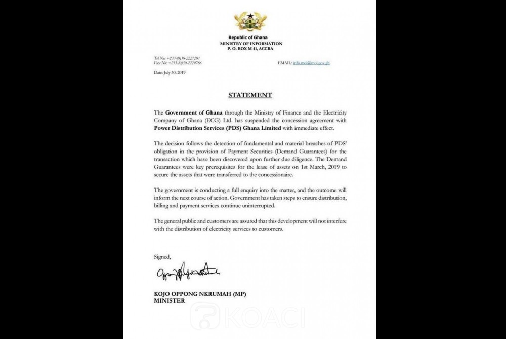 La suspension de l'accord de concession avec le PDS est rendue publique par le ministre de l’Information, Kojo Oppong Nkrumah.