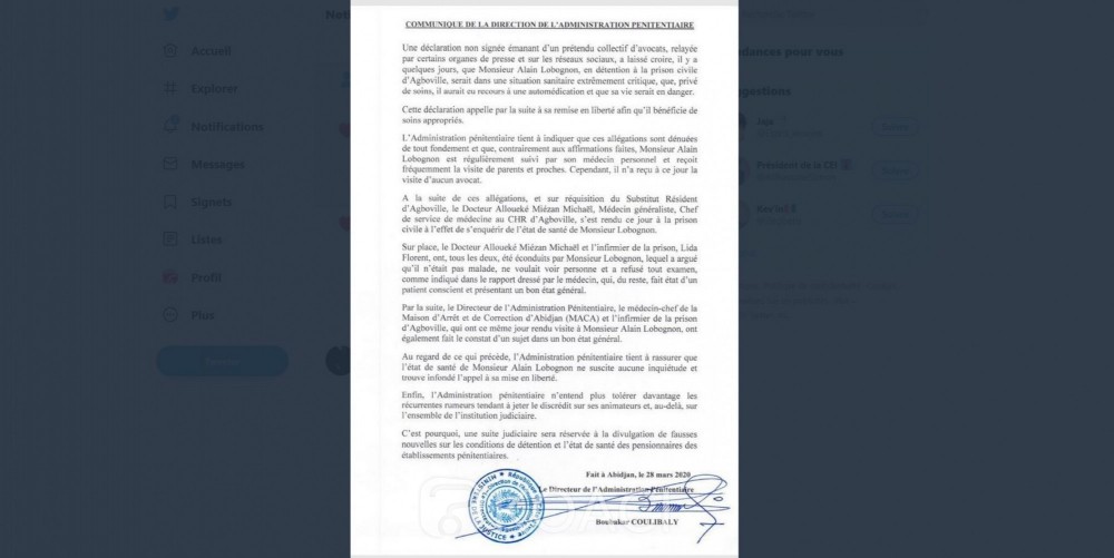 L'administration pénitentiaire a, ce soir, à travers un communiqué, confirmé les informations ce matin révélées par KOACI, Alain Lobognon est en bonne santé contrairement à un communiqué non signé d'un soi-disant "collectif d'avocat" qui alarmait sur son état, et a menacé de poursuites pour divulgation de fausses nouvelles, ceux qui l'ont diffusé sur internet.