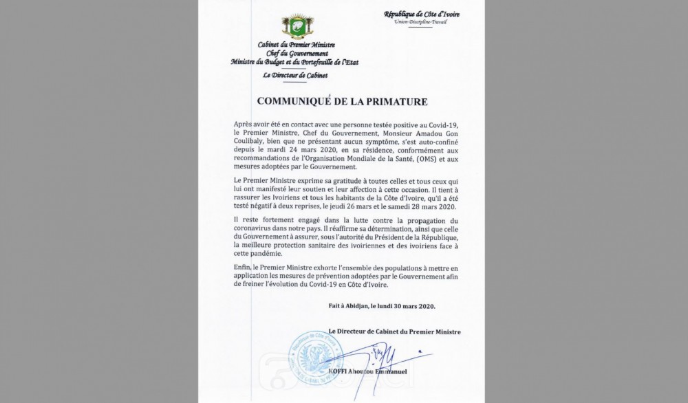 « Il (Amadou Gon Coulibaly, ndlr) tient à rassurer les Ivoiriens et tous les habitants de la Côte d’Ivoire, qu’il a été testé négatif à deux reprises, le jeudi 26 mars et le samedi 28 mars 2020. », y explique Emmanuel Ahoutou Koffi.