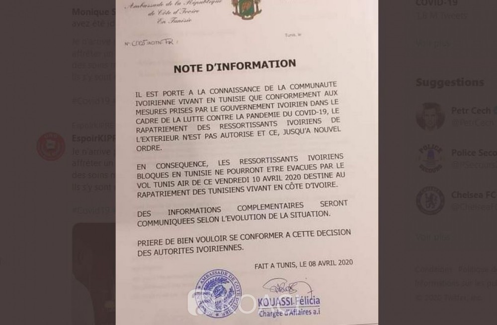 Dans le cadre des mesures prises pour lutter contre le Coronavirus, à travers une note diplomatique transmis à KOACI, le rapatriement des ressortissants ivoiriens de l’extérieur n'est pas autorisé et ce, «jusqu'à nouvel ordre ».