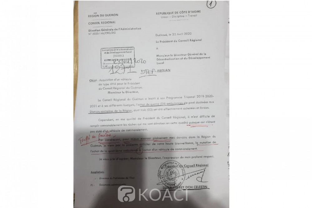 Comme nous l'évoquions, fort d'un document transmis, Serey Doh a bel et bien demandé par courrier à la décentralisation qu'une ambulance soit remplacée par un véhicule de commandement à sa destination.