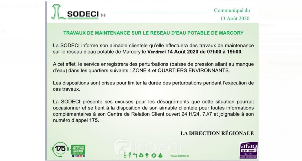 5 Côte d'Ivoire : Communiqué de la SODECI relatif à la coupure d'eau du mercredi 6 nov...