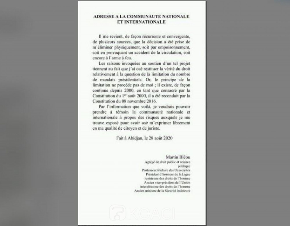 Martin Bléou voudrait prendre à témoin la communauté nationale et internationale à propos des risques auxquels il se trouverait exposé pour dit-il avoir osé s’exprimer librement en sa qualité de citoyen et de juriste.