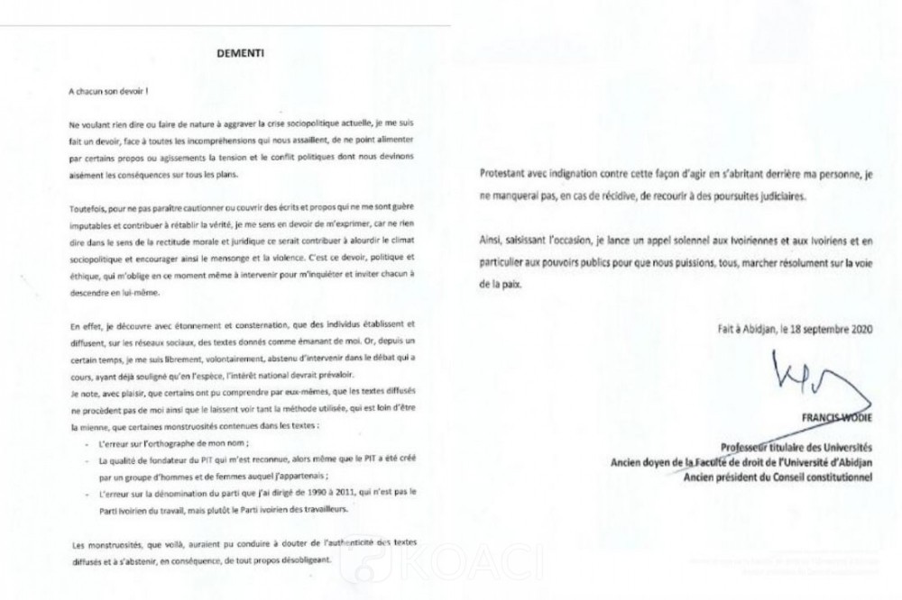 Grosse colère de l’ancien président du Conseil Constitutionnel, Francis Vangah Wodié. Dans un démenti formel ce vendredi dont KOACI s’est procuré une copie, il dit découvrir avec étonnement et consternation , que des individus établissent et diffusent , sur les réseaux sociaux , des textes donnés comme émanant de lui.