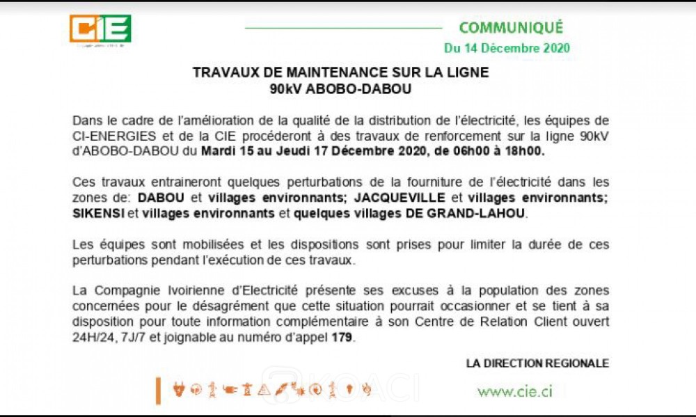 Côte d'Ivoire : Travaux de maintenance sur la ligne 90 kV Abobo-Dabou , communiqué de la CIE