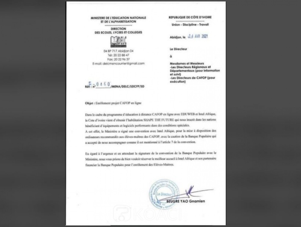 Comme nous le relevions dans un précédent article, la Directrice des Écoles, Lycées et Collèges (DELC), Mme Yao Gnamien épouse Beugré, a exigé des élèves-maîtres des Centres d'animation et de formation pédagogique (CAFOP) de s’offrir un ordinateur via la structure dénommée Intel Afrique avec la caution de la Banque Populaire de Côte d’Ivoire.