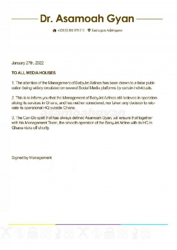 Des raisons de ce démenti, on peut souligner que des informations ayant circulé sur les réseaux sociaux et qui ont atteint leur pic hier jeudi ont laissé croire que Gyan projette de déplacer le siège de sa compagnie aérienne en Côte d'Ivoire voisine en raison de difficultés administratives que la société rencontre au Ghana. Les rumeurs ont laissé croire que Gyan est frustré par les responsables de l'industrie aéronautique au Ghana.